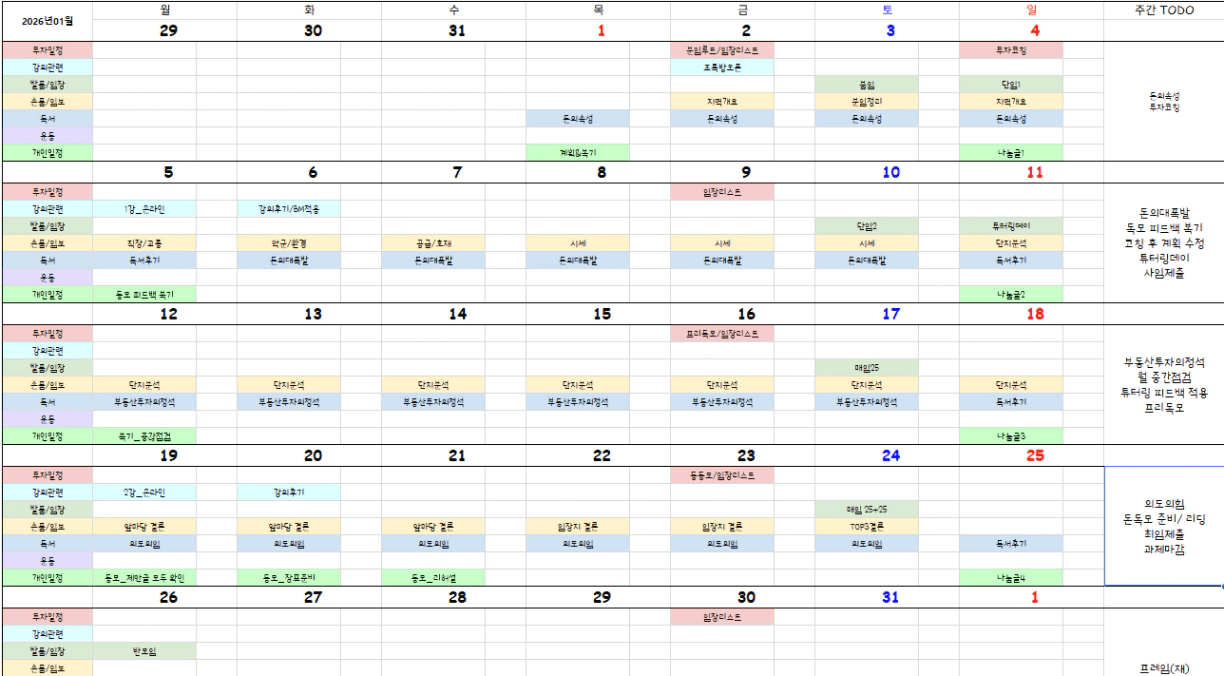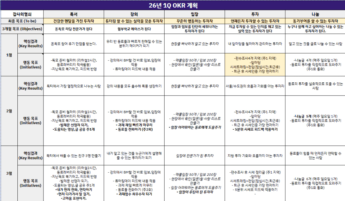 26년 1월 목표 : 주 1개 지역 전수조사와 앞마당,임장지 전임을 통해 현장의 시세와 상황을 아는 투자자가 된다.