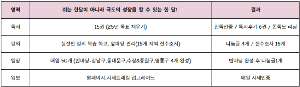 • 성과 :  16권 완독 / 독서후기 10권 / 돈독모 리딩