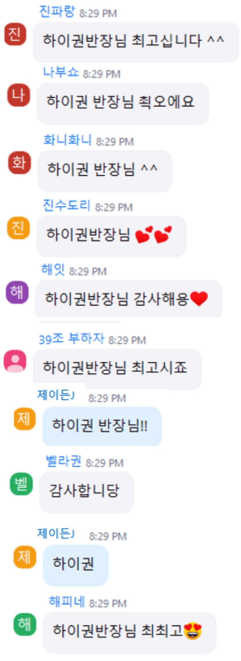 하이원 반장님의 뜨거운 열정과 유쾌한 에너지 덕분에 따뜻한 연말 보냈습니다. 누구보다 바쁘실텐데 먼저 손 내밀어 주시고, 적극적으로 도와주셔서 넘 감사했어요. 하튜로 성장하실 수 있기를 진심으로 응원합니다. 그리고 부디 내년 크리스마스는 좋은 짝꿍이랑 함께 하시기를^^