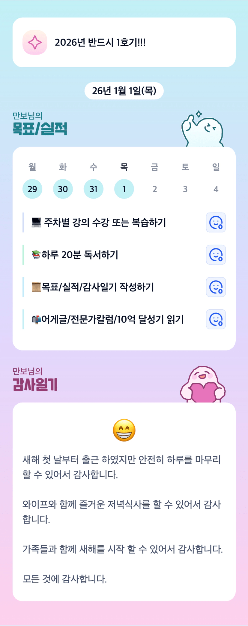 오늘 새해 첫날도 근무하셨군요~ 그래도 긍정적으로 생각하시고, 하루 마무리하신 거 멋져요^^ 아내분과 즐거운 식사시간도 행복했을 거 같아요ㅎㅎㅎ 만보님~ 한 달 동안 교대근무로 힘든 상황에서도 끝까지 함께 완주해주셔서 감사해요:)