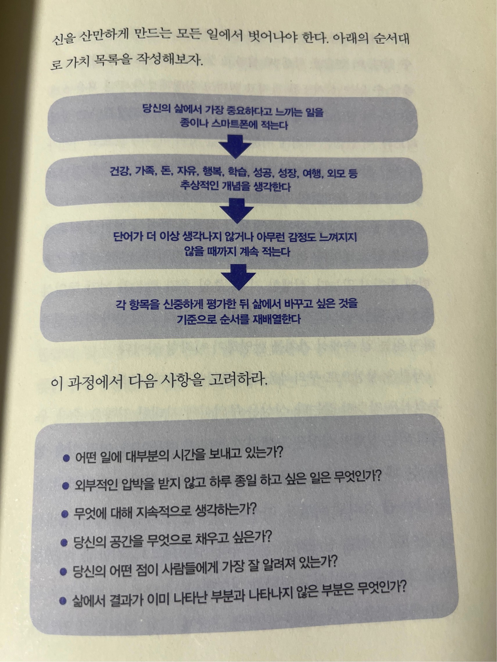 공책이나 스마트폰, 노트북에 항상 목록을 지니고 있어야 한다. 끊임없이 자신에게 상기시켜야 한다. 가장 좋은 방법은 잠자리에 들기 직전과 잠에서 깨어난 직후에 목록을 읽는 것이다. 실행한지 몇 주일 후면 당신의 뇌가 무의식적으로, 직관적으로 기억하게 될 것이다. 그리고 당신이 하는 일과 하지 않는 일 속에서 가치를 반영하기 시작할 것이다.