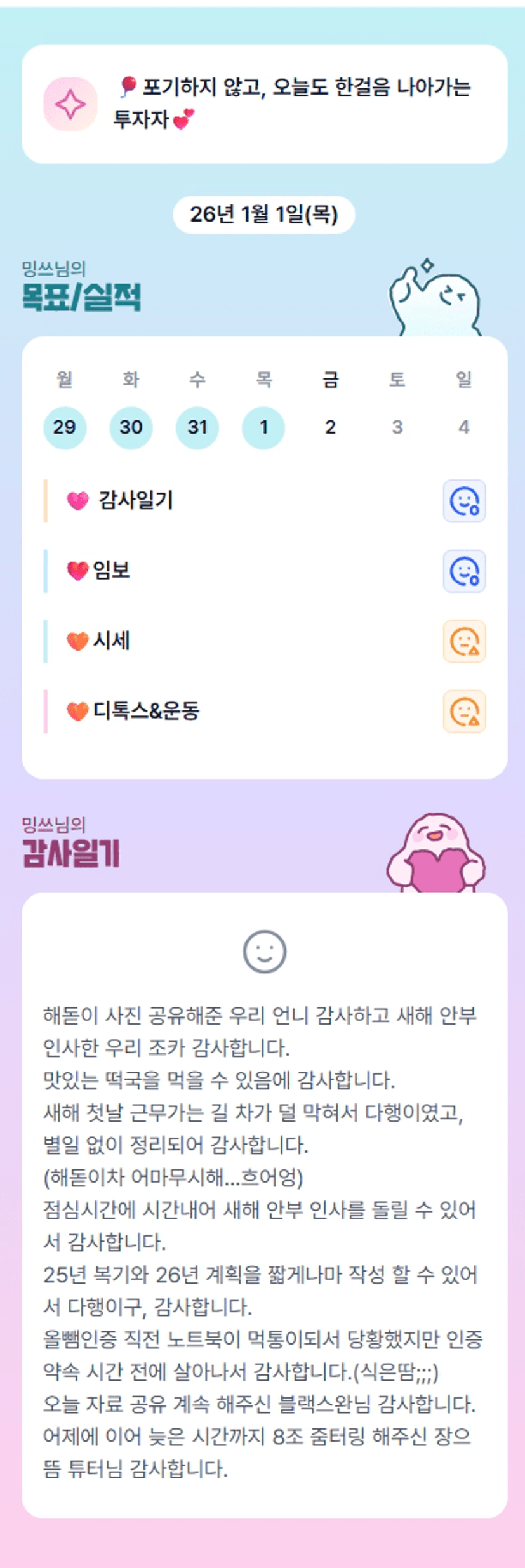 우리 밍쓰님~~ 저도 해돋이 차막힘 지옥에 한 번 갇힌 이후로 집에서 유튜브 해돋이 실시간 라이브로 해결하기로 했어요❤️🔥ㅋㅋㅋㅋㅋ 알차게 새해 시작하신 밍쓰님 오늘도 할 일로 가득채워 나가는 기똥찬 하루 만들어가셔요👍🏼 화이팅!