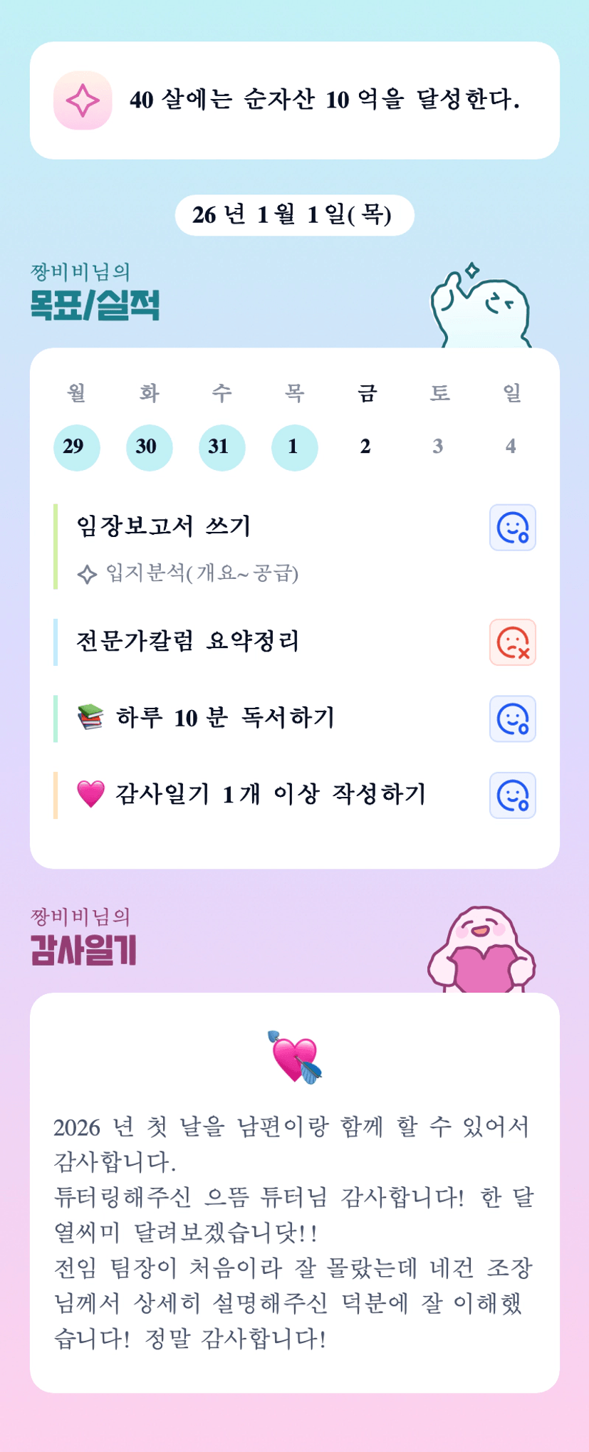 짱비비 전임팀장님~~ 새해 첫 조에서 함께 할 수 있게 되어 너무 영광이고 한달 동안 잘 부탁드리겠습니당~~