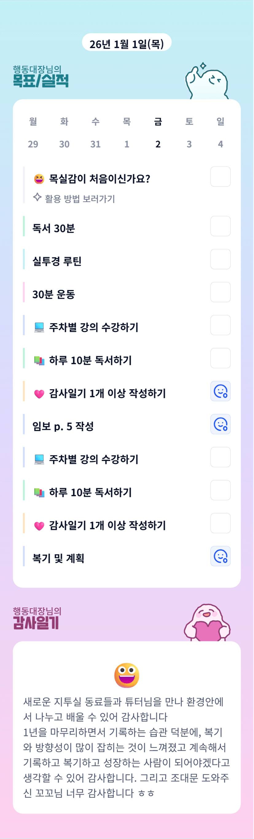대장님~ 새해 첫 한 달 함께할 수 있어 너무 기대되네용 ^^ㅎ