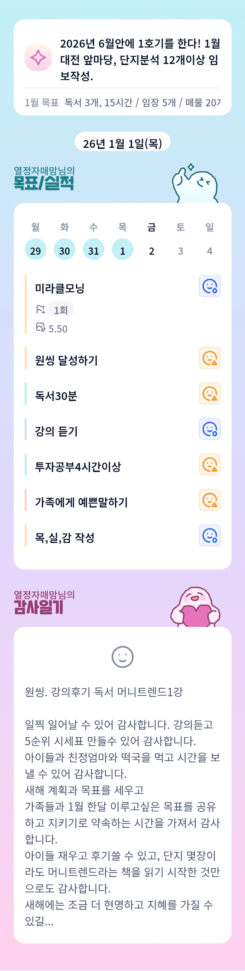 새해에 꼭 바라시는 데로 됩니다. 믿으면 이루어져요^^ 당장은 티가 잘 안나도 조금씩 하면 분명히 나아집니다~ 자매맘님 1월 대전 앞마당 화이팅입니다💚