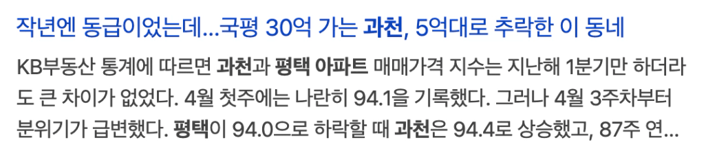 특히 최근 위 기사처럼 경기도 내에서도 과천 같은 핵심 입지는