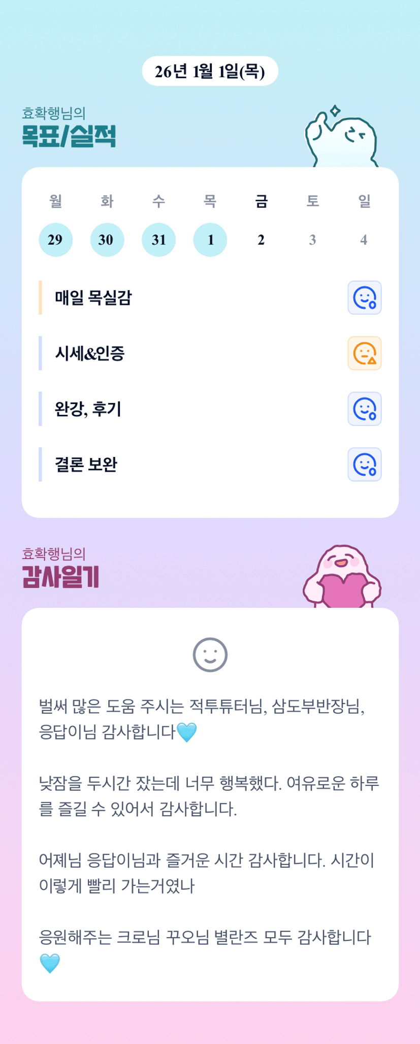 우왕~~낮잠 2시간 단어만 봐도 넘넘 꿀같은 시간이네용!! ㅎㅎ 2026년 반장님과 함께 힘차게 시작하겠습니당 ^^ 💛