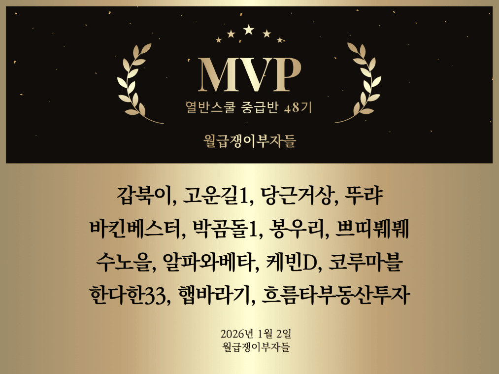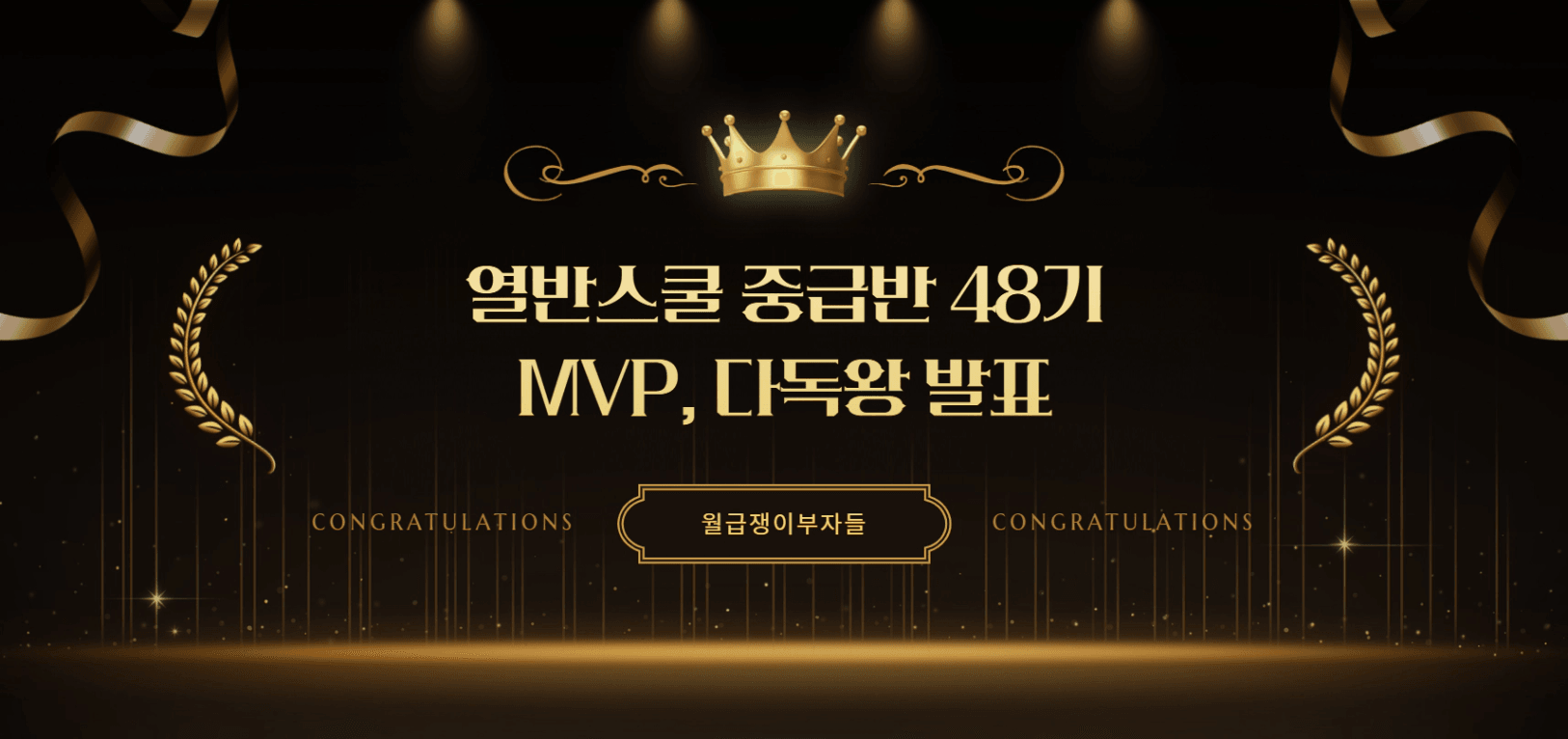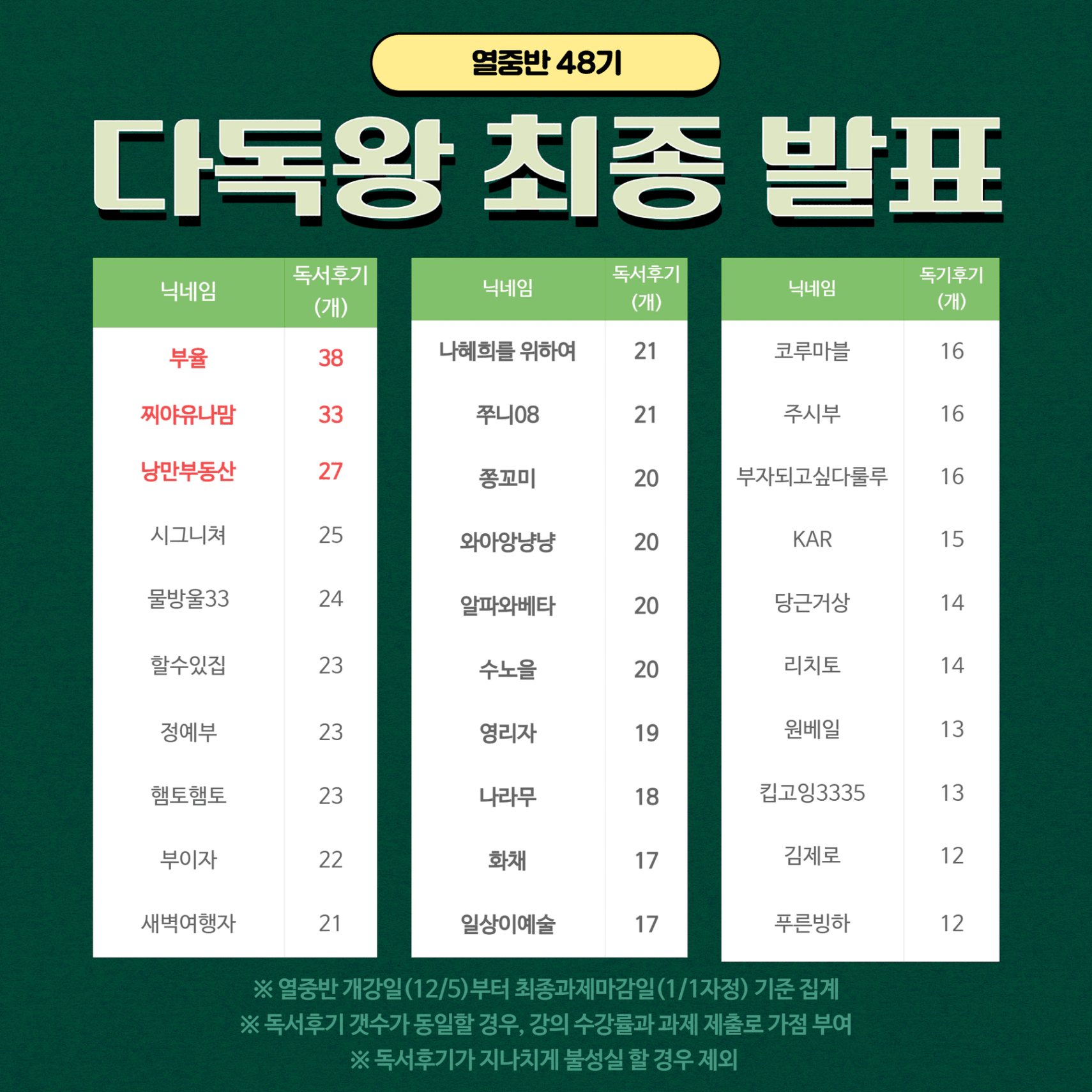 열중 48기 다독왕분들께는 1/5(월) 개별 문자 안내 예정입니다. 수고 많으셨습니다!
