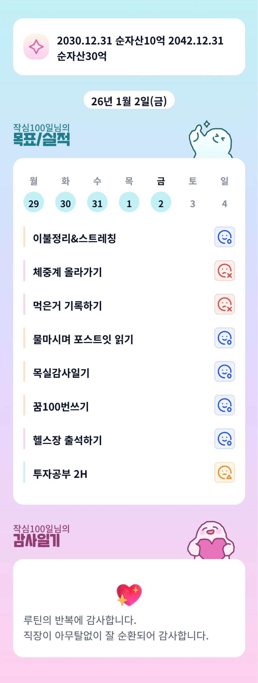 이불정리 → 스트레칭 → 컴퓨터 앞에서 물 마시면서 꿈 읽기 → 꿈100번쓰기 → 목실감 → 헬스장 출석(운동)