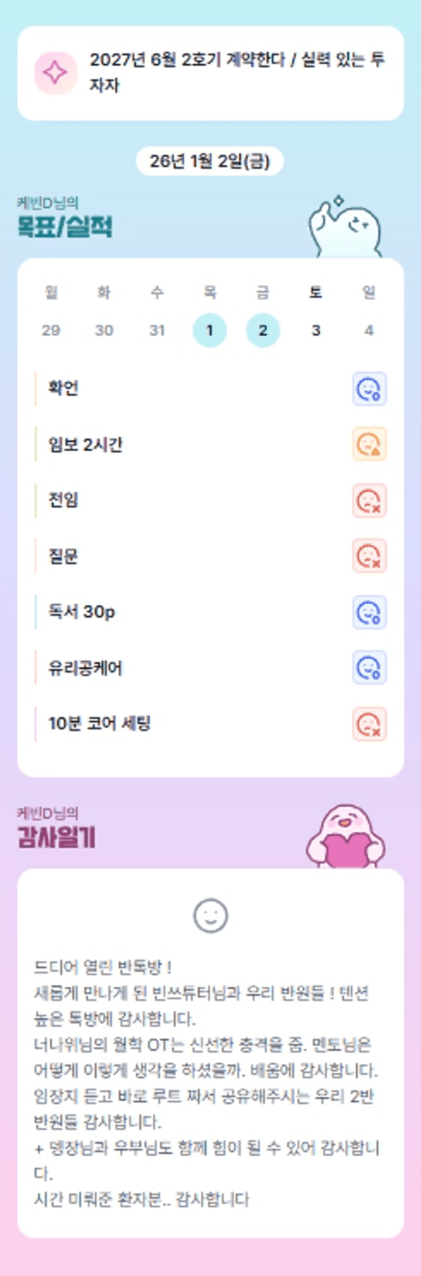 케부님 직업이 더욱더 궁금해지는 1인,,,ㅎㅎㅎㅎ 덕분에 우리 케부님이 오티 들을 수 있었습니다 감사합니다 ㅎㅎ 케부님 3개월간 다같이 2반의 성장에 몰입해보아요~ 화이팅!!♥️♥️