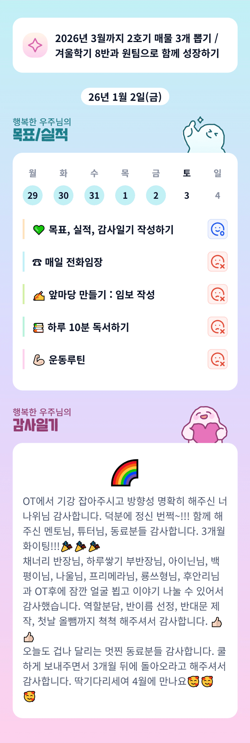 행부님!! 번개 줌에서 얼굴을 뵐 수 있어 너무 좋았습니다. 앞으로 3개월 잘 부탁드립니다 😊