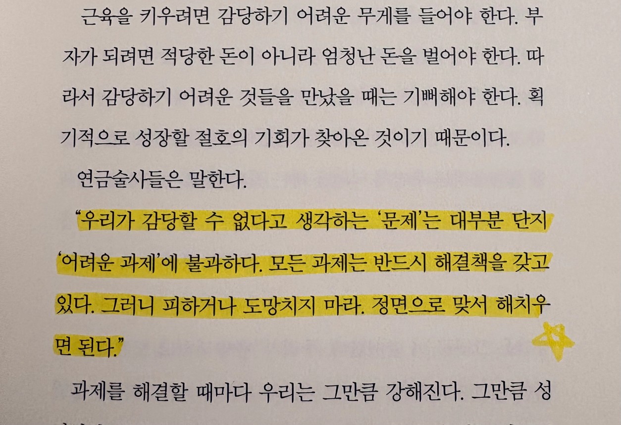 : 나는 살면서 종종 일상생활에서 내가 은은(?)하게 겪는 사건들이 조금 더,, 있는 편이다,,ㅜㅜ 지나고보면 내가 생각해도 웃길 때가 있어서 썰들로 친구들에게 말해주곤 했는데 점차 살다보니,, 그리고 월부에 들어오고 난 후, ‘이제는 그런 사건들을 겪고싶지 않다’, ‘나도 다른 사람들처럼 어려움이나 이슈없이 순탄하게 흘러갔으면 좋겠다.’ 라는 생각이 들곤 했고 나도 모르게 근본없는 ‘행운’ 을 바라기도 했던 것 같다. 멘탈의 연금술은 문제와 어려움을 만나면 내가 성장할 수 있는 계기가 되어줄 재료들이라면서 두팔 벌려 환영하라고 한다. 지금 고민이 없거나 힘들지 않다고 느끼고 있다면 성장은 멈춘것.. ( 보도섀퍼는 문제를 안만나는 편안항 상태가 계속된다면 계단에서 계속 내려갈 일만 남은거라고 말했다. ) 내 생각해보면 살면서 어려움을 만나게 되는건 당연한건데,, 이를 바라보는 프레임을 다시끔 수정할 수 있었던 계기가 되었다.