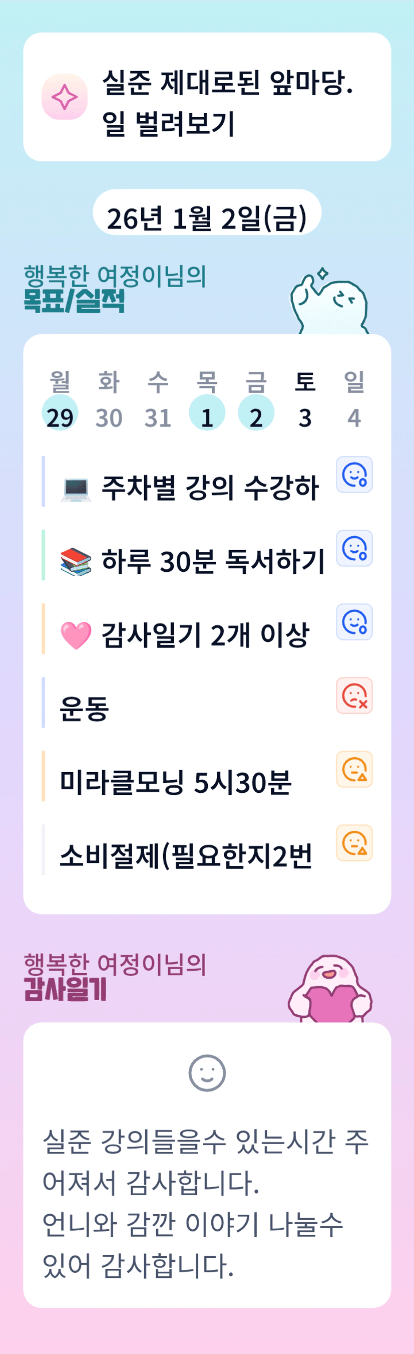 금요일 목실감 작성 달성하셨군요. 오늘도 꼭 달성해요! 화이팅!