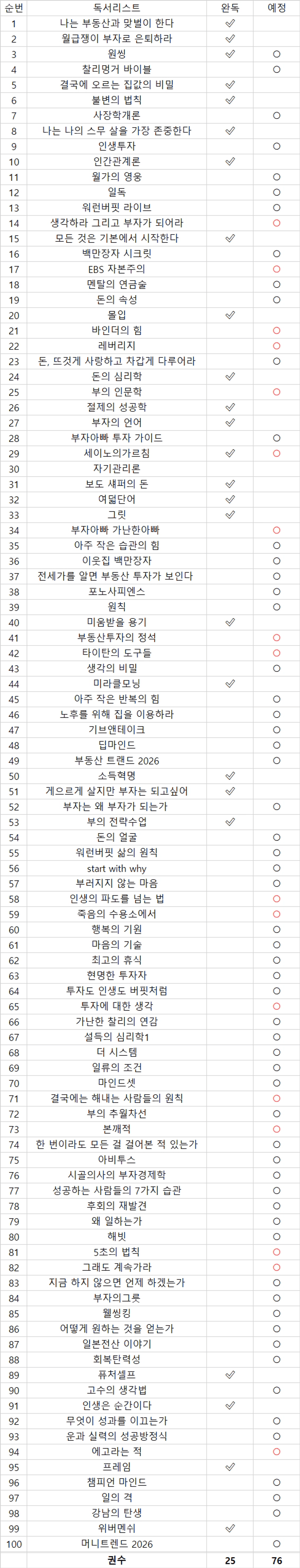 • 매일 읽을 수 있는 페이지수를 정한다. 일 년에 50권, 한 달에 2.5권, 한 권당 300p로 예상, 하루에 25p씩.