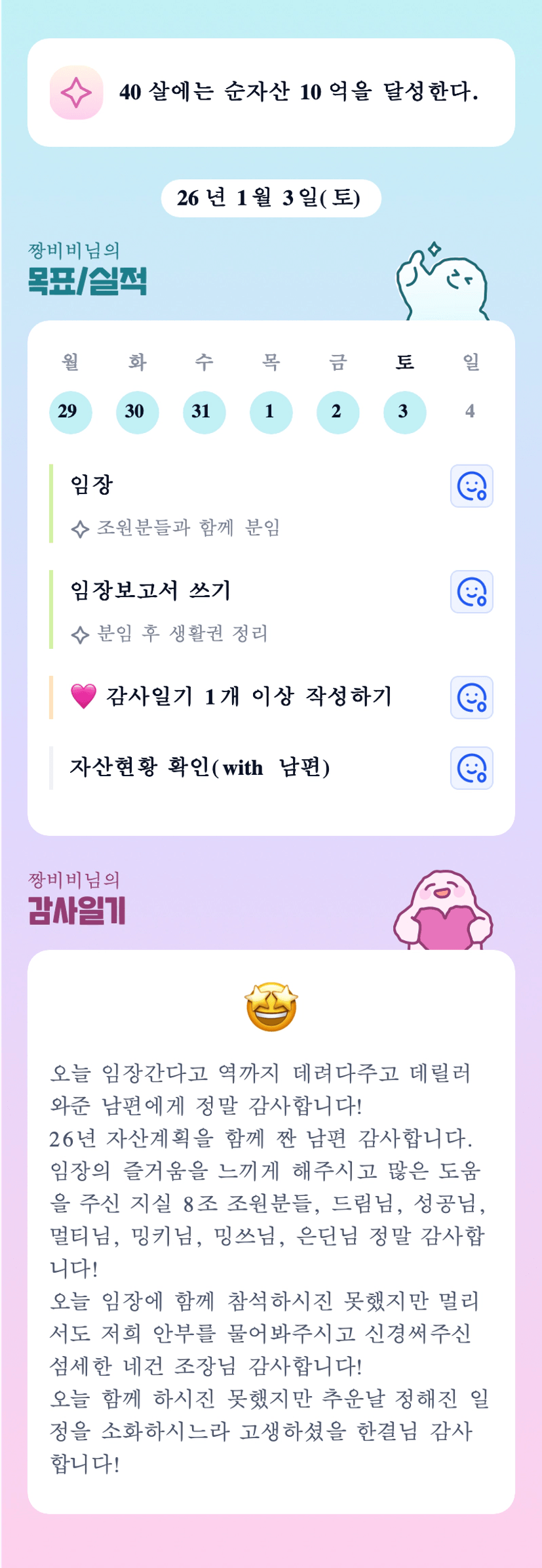 비비님!! 덕분에 임장 재미나게했어요!! ㅎㅎ 몸 잘 풀어주시고요! 정말 고생많으셨습니다💕