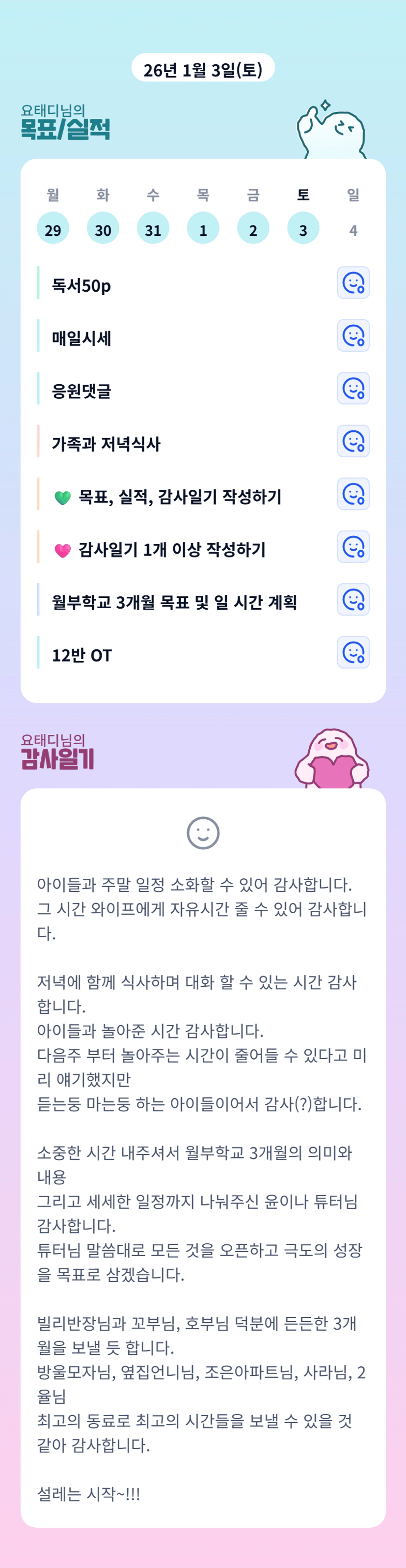 크! 오늘 아내분께 자유시간 드린 후에 자녀분들과 시간 보내셨군요!ㅎㅎㅎㅎㅎㅎ 극도의 성장!! 함께해보시죠 태디님! 오늘도 고생 많으셨습니다ㅎㅎ