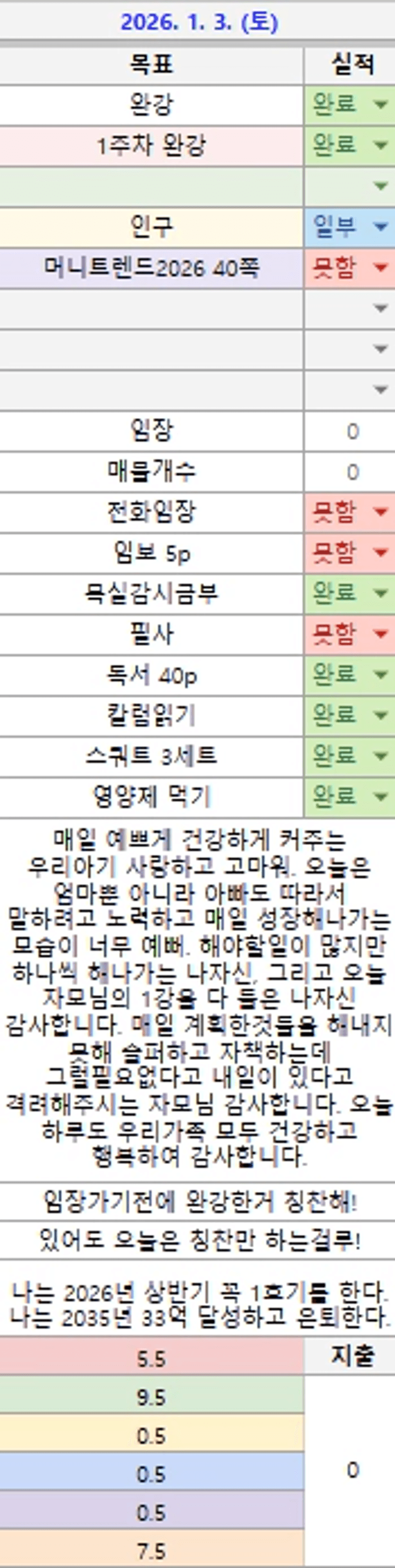 #자기암시나는 항상 투자를 생각하고 실천하는 실전투자자이다나는 시간을 소중히 여기고 과정을 즐기며 목표를 달성한다나는 작은 것에도 감사한다나는 매 순간 실력을 쌓는데 집중하고 성장하여 시장에서 살아남는 투자자가 된다내가 꿈꾸는 삶으로 만들기 위해 오늘도 열심히 노력한다나는 할 수 있다.