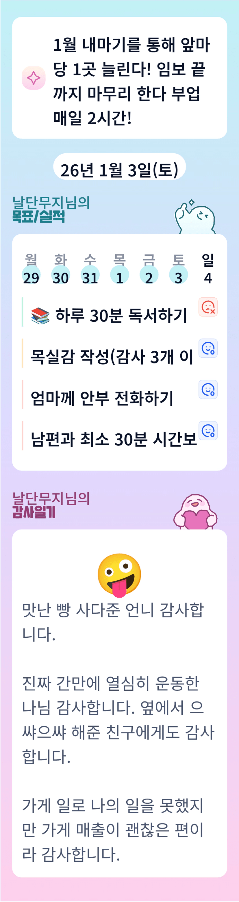 꾸준함이 중요하다. 부정적인 생각이 몰아닥칠 때 독서와 운동을 한다.