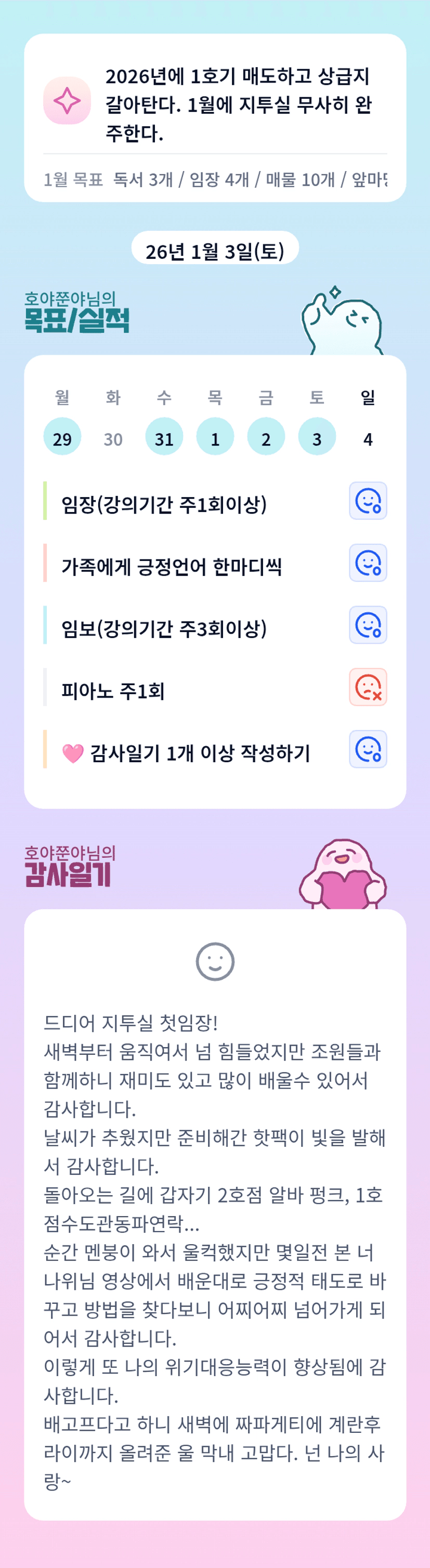 호야님~ 힘드셨을텐데 마인드 잡고 해내신 거 넘 멋지세요♡ 그리고 덕분에 임장하면서 따뜻하게 할 수 있었습니다! 간식도 최고최고 감사합니다♡