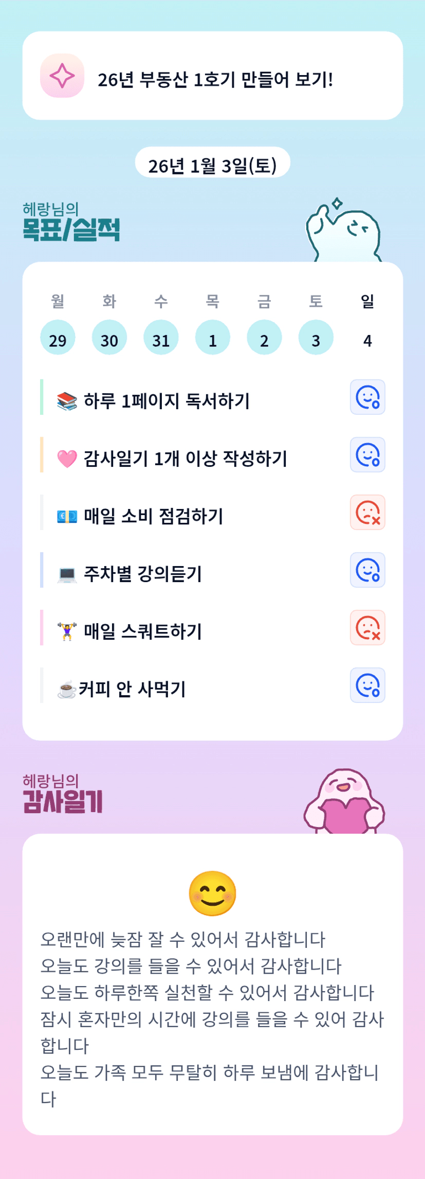 작은 성과가 쌓이는게 중요하대요. 오늘도 쌓인 성과들을 보며 잘했다 해주기! 고생하셨습니다!