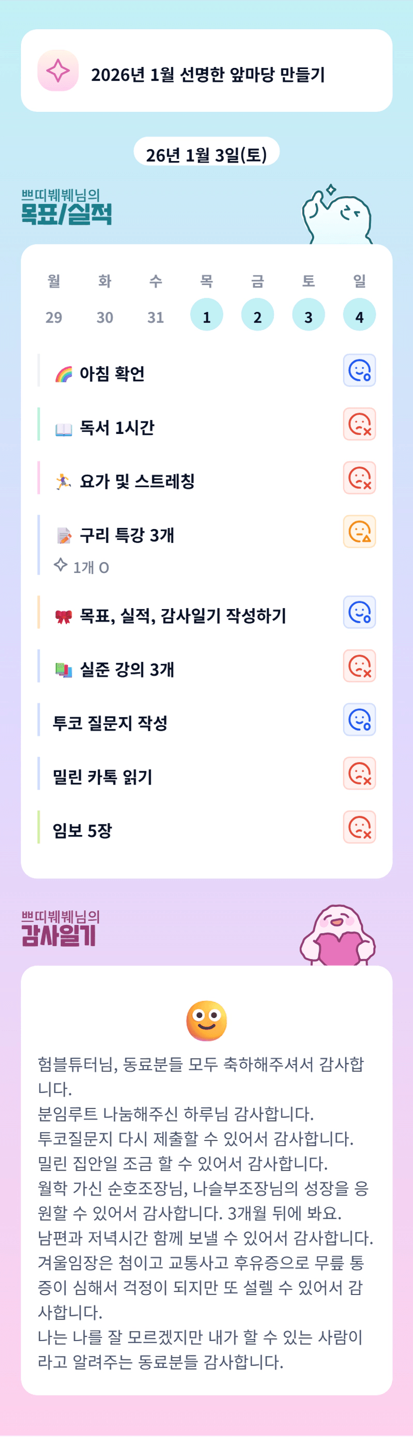 쁘띠님! 투코질문지 다시 제출 고생하셨어요~! 주중에 컨디션 회복을 기원하며~ 오늘 저녁에 만나요^^