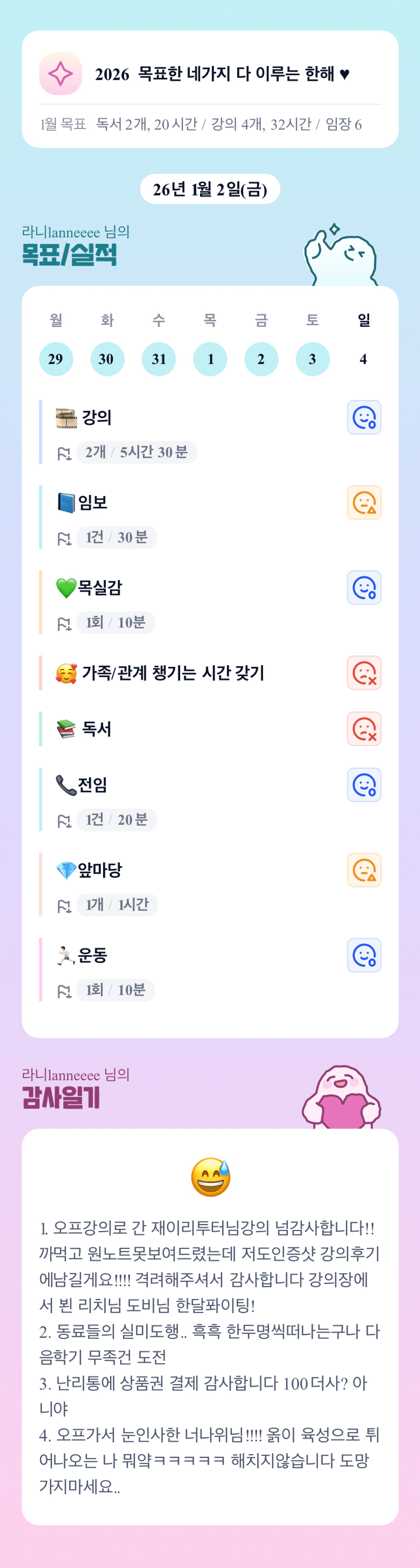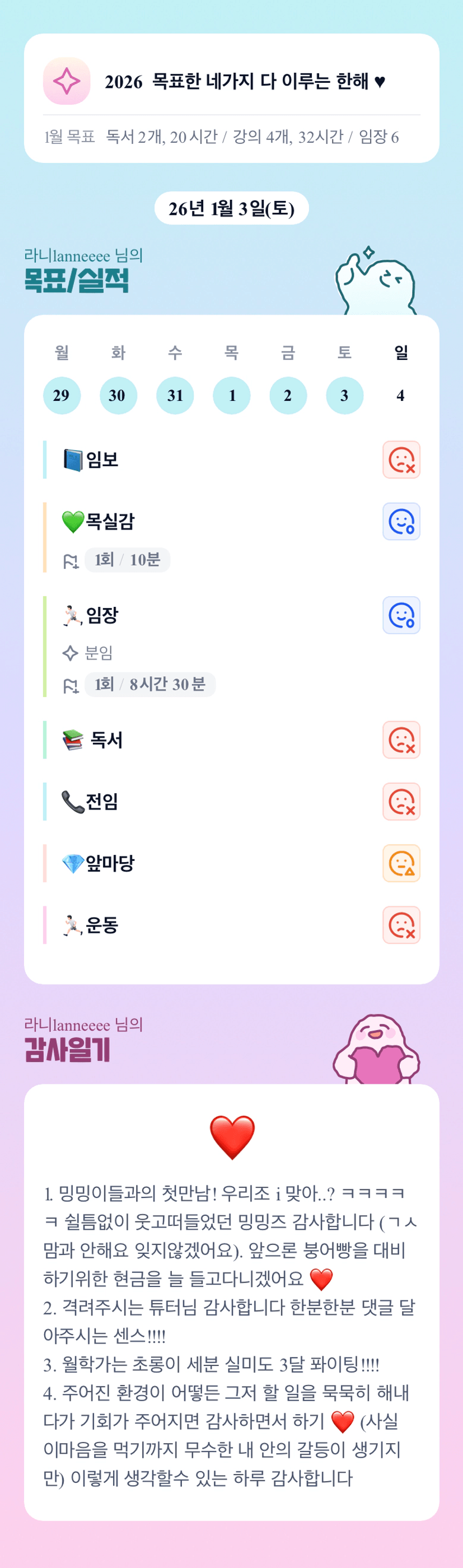 [2026 확언]1. 나는 2026년 12월 31일 목표한 지방 광역시 앞마당을 뽀갰다2. 나는 2026년 12월 목표한 대로 1호기 매도한다.3. 나는 2026년 관계로써 성장한다.4. 나는 2026년 마음맞는 동료들과 함께 즐겁게 일하고 있다.
