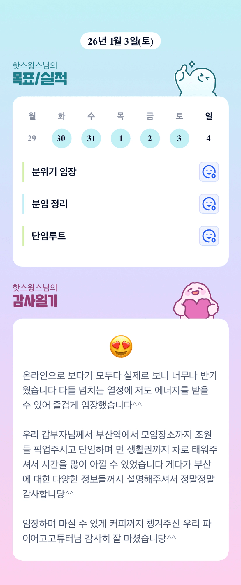 핫스윙스님 어제 수고많으셨습니다. 오늘도 빠이팅이에요 이따가 뵈요~^^