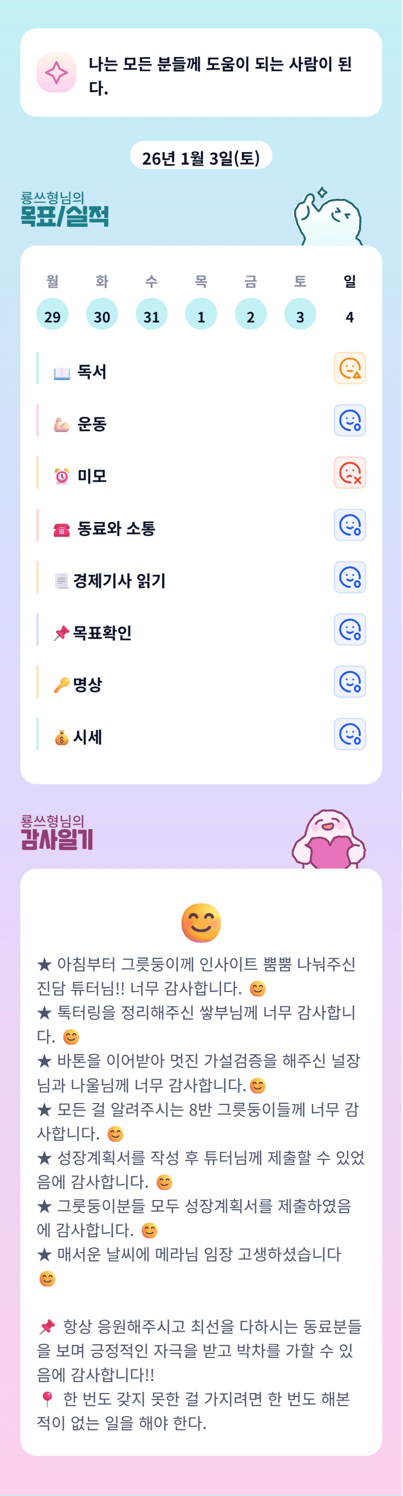 행님~! 한분한분 짚어가며 우리반에 감사한 마음 전해 주셔서 너무 감사드려요 :) 좋은 하루 되시고 잠시 후 OT때 뵈어요!!💛