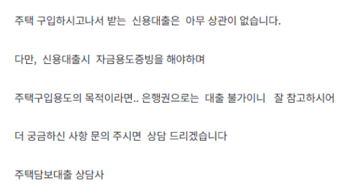신용대출을 일으켜서 바로 주택구입에 보태쓰게 되면 규정상 안되는것인지 확인이 필요해서 여쭤봅니다