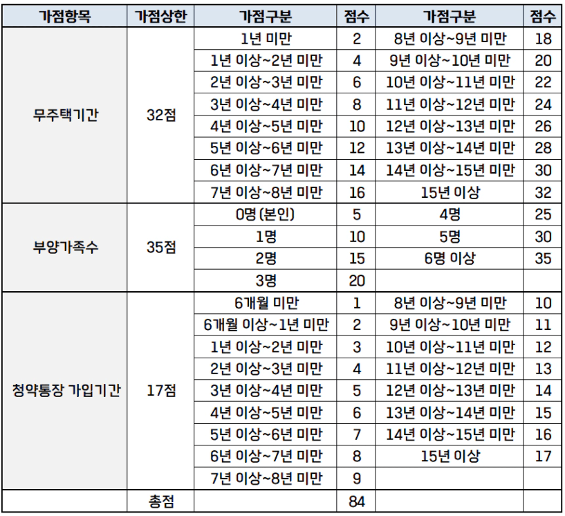 청약 가점은 총 84점 만점으로, 다음 세 가지 요소로 구성됩니다.
