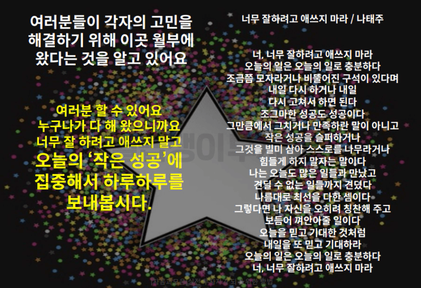 “여러분 할 수 있어요. 누구나가 다 해 왔으니까요. 너무 잘하려고 애쓰지 말고, 오늘의 작은 성공에 집중해서 하루를 보내보세요.”