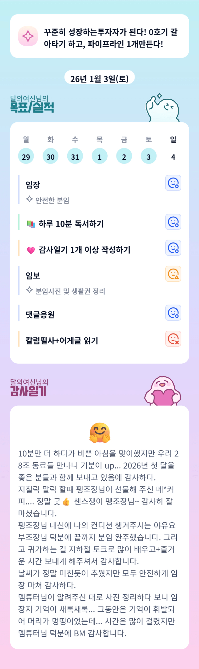달님 감사일기에도 달님의 따스함이 고스란히 묻어나네요 ㅎㅎㅎ 사소한 것에도 감사함 가득 담아 써주셔서 저까지 기분이 좋아지네요 ㅎㅎㅎ 감사합니다!