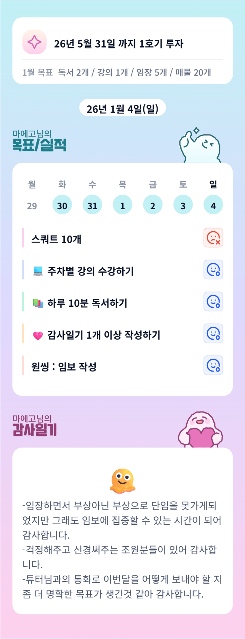 에고님 임보작성하는 하루 보내셨군요~! 주말 고생 많으셨습니다 남은 기간 화이팅입니다!