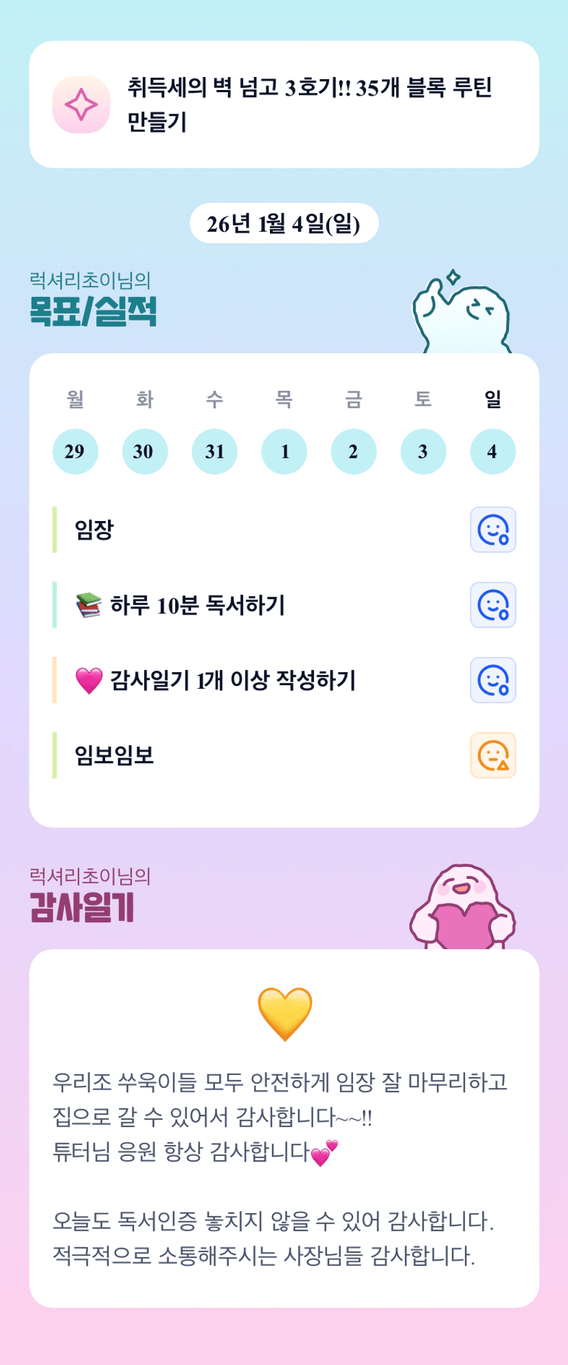 조장님 덕분에 빨리 완주해서 좋았습니당! 이번주도 화이팅입니다 😊