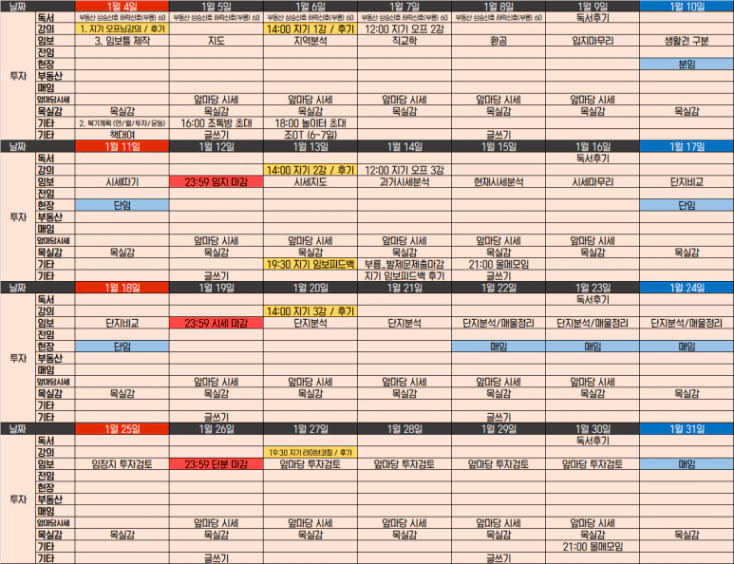 각각 투자, 재무, 강의, 임장/임보, 독서, 나눔/성장/마인드, 가족/건강/회사의 영역별로