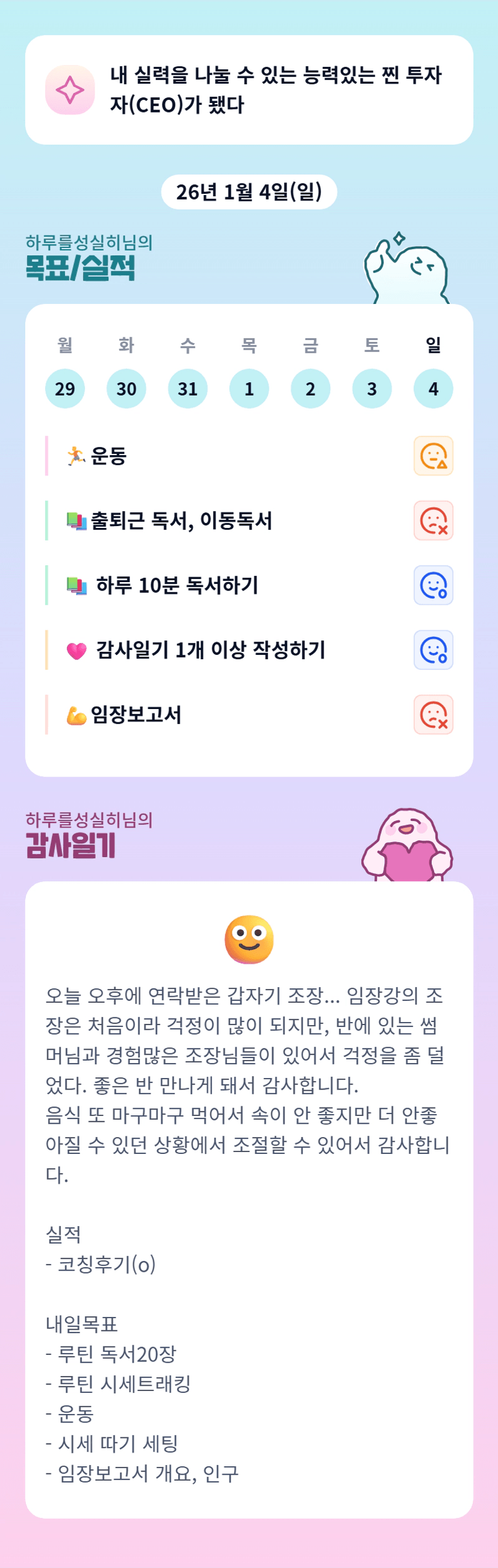 조장 축하드려요~~~ 코칭후기대로 방향 잡아가심 좋은 결과 있으실 듯 합니다. 화이팅!