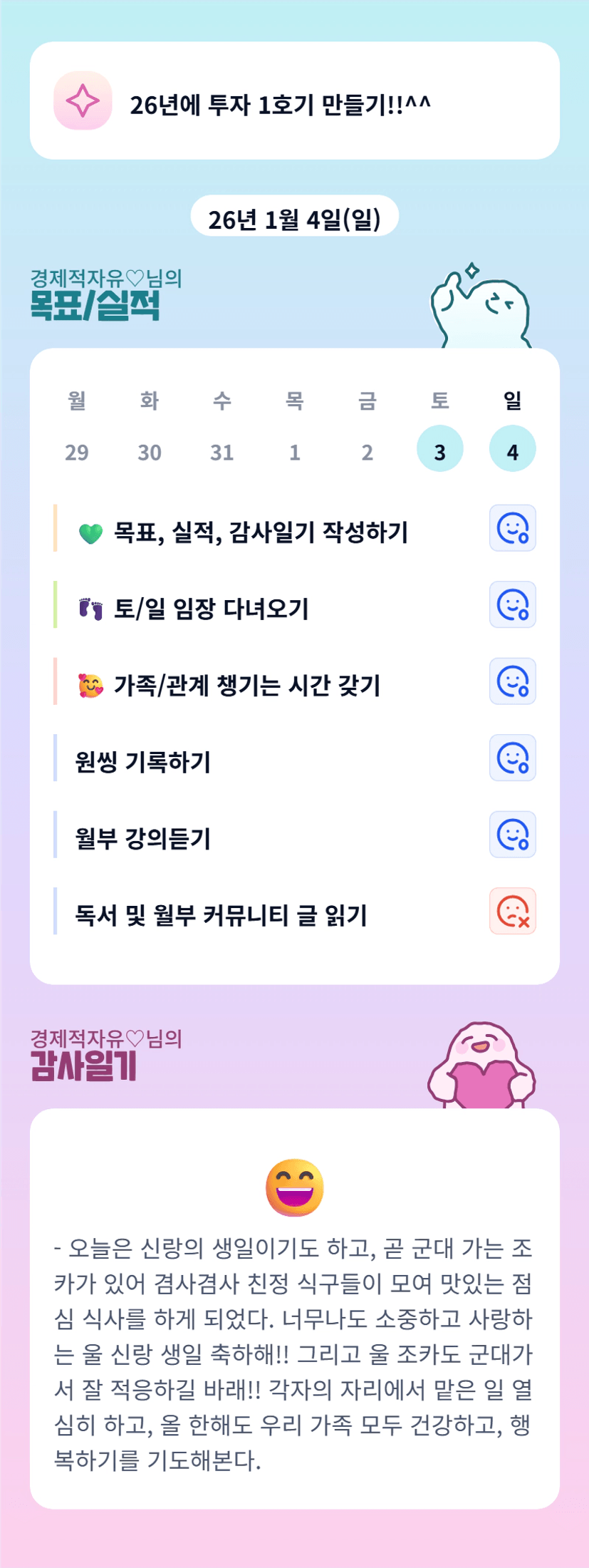 축하할 일이 많은 날이셨네요. 가족도 잘 챙기시랴 과제도 하시랴, 바쁘셨지만 보람있는 하루를 보내신 자유님을 응원합니다!💪👍🏻
