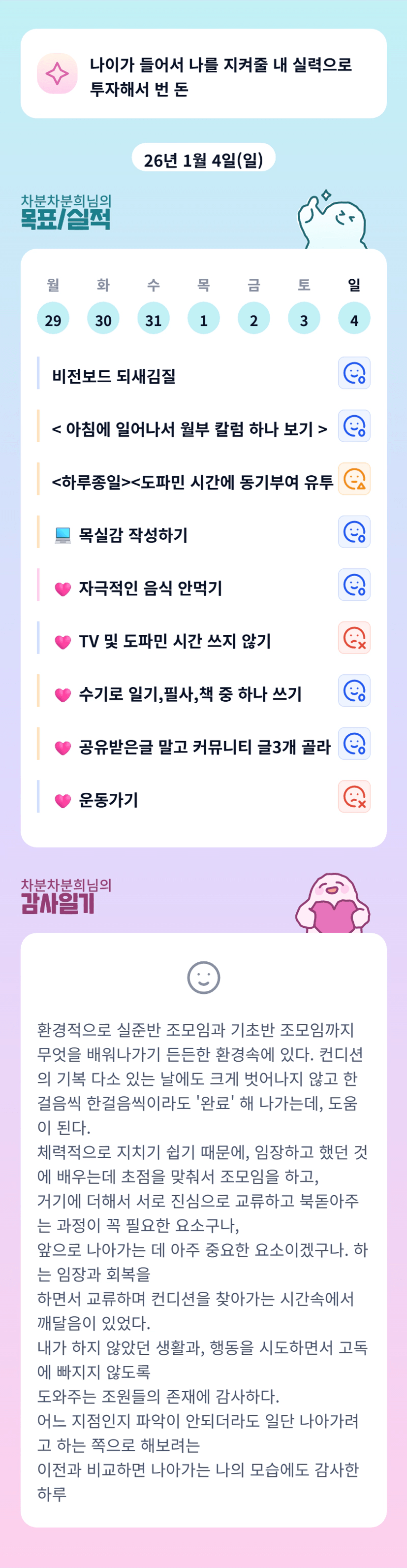 오늘도 성장하신 차분차분희님, 정말 대단하셔요! 어제의 나, 아파트하고만 비교하기라는 말이 있는데 이미 실천하고 계시군요!