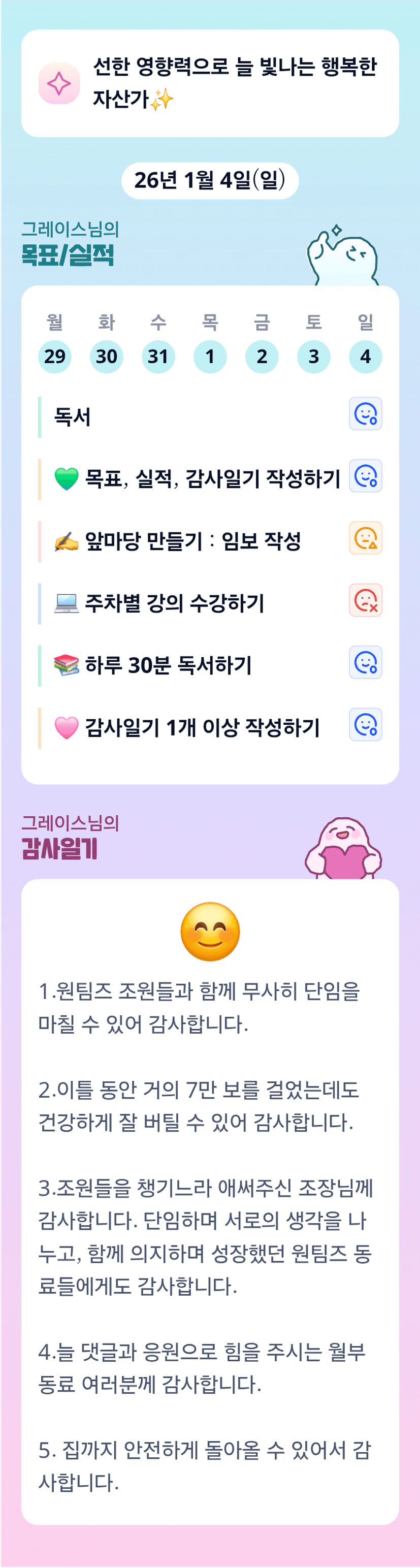 고생하셨습니다. 그레이스님 우리들의 멋진 날을 위해 화이팅~ 💪💖💖