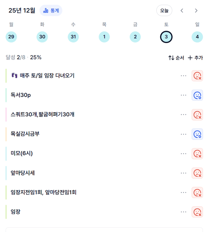 예) 토요일부터 목요일까지 목실감을 쭉 하루하루 적어보면서 스스로 중요한 부분은 놓치지 않고 해낸 것 같아 뿌듯하다.