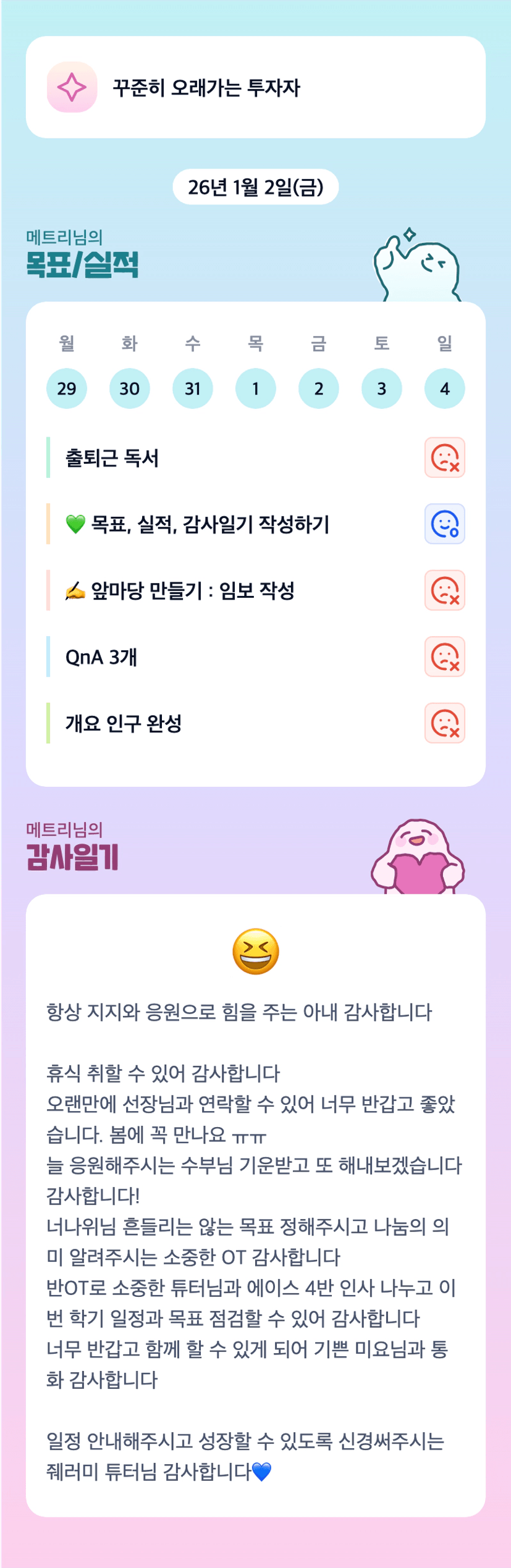트리님! 방학 잘 보내셨나요?!ㅎㅎ 오늘부터 같이 빠이팅 해봐요!! 조금이다 봐요 트리님!! : )