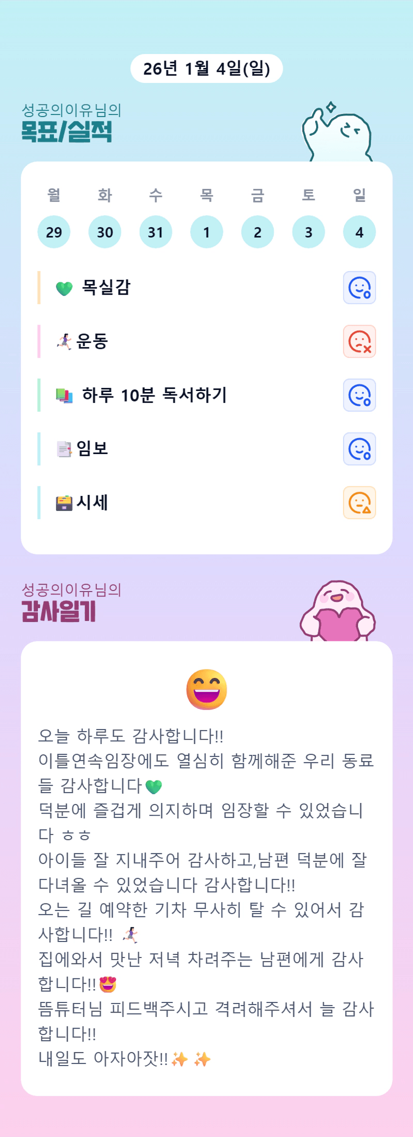 우리 성공님~ 지난 주말 완전 성공적이네요 ㅎㅎ 넘 고생 많으셨어요~! 오늘은 컨디션 회복도 쭉쭉하시고 기똥찬 일주일 열어가셔요~~ 늘 감사해요! 화이팅!!♥