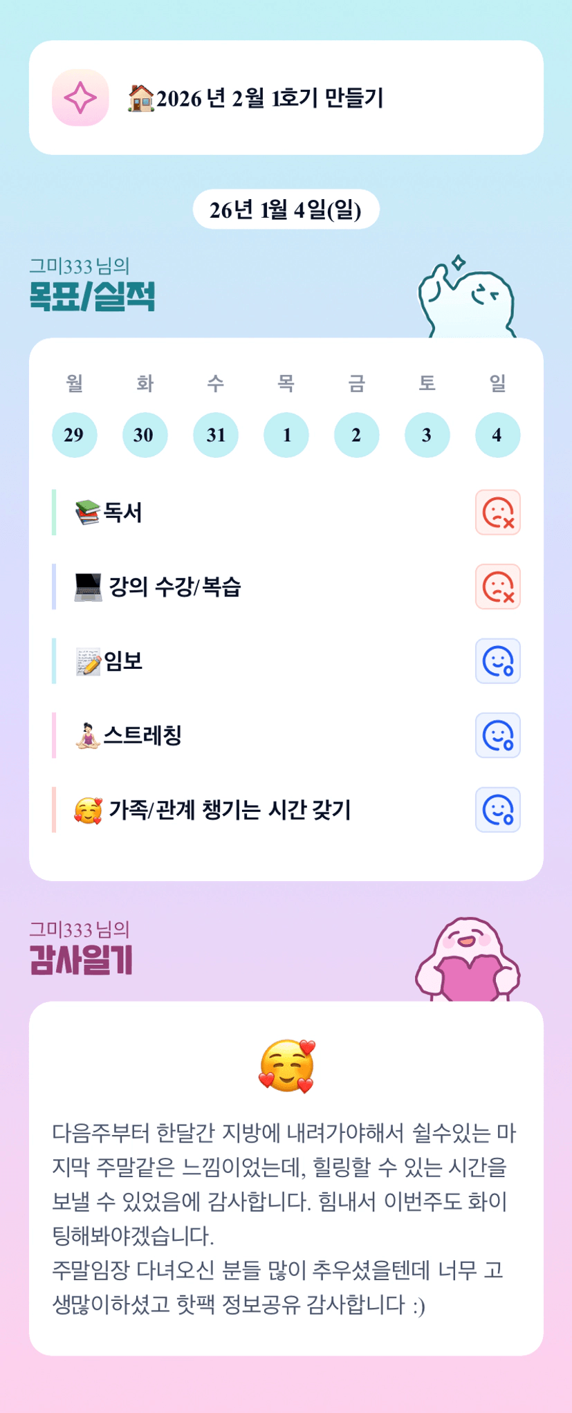 그미님 재충전 잘하셨군요!!!지방 음청 추우니 임장템 잘 챙겨가셔요:) 따뜻하고 즐겁게 빠이팅!!!🔥