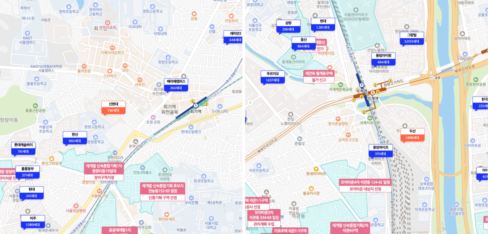 첫번째로 살펴볼 단지는 동대문구 회기역 역세권에 있는 신현대 아파트이고 7.7억에 거래가 되었습니다. 회기역 임장을 가시면 파전골목에서 파전을 드세요. 암튼 회기 쪽은 대학교가 많이 위치한 곳이라서 대학 상권이 발달된 곳입니다. 1호선 경의중앙선 더블역세권이긴 하지만 경의중앙선은 없다고 치고... 크흠...