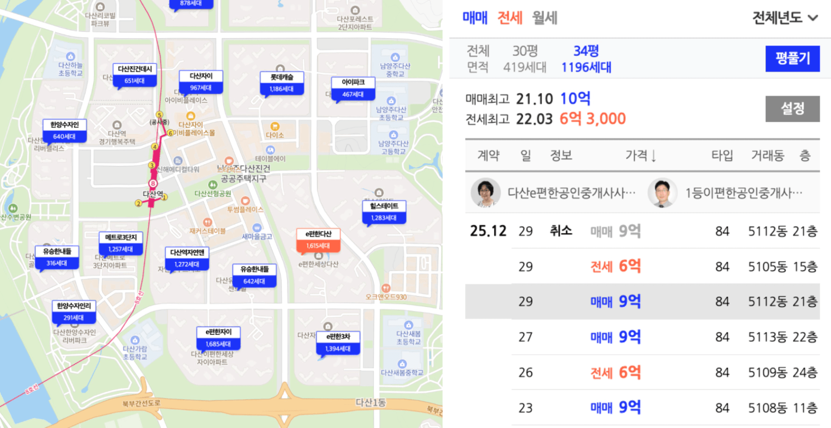 그런 의미에서 남양주시 거래 된 e편한세상 다산 아파트를 살펴보도록 하겠습니다. 9억에 거래가 되었고요. 현재 전세가는 6억에 거래가 되고 있습니다. 투자금은 3억 정도 예상할 수 있겠네요.