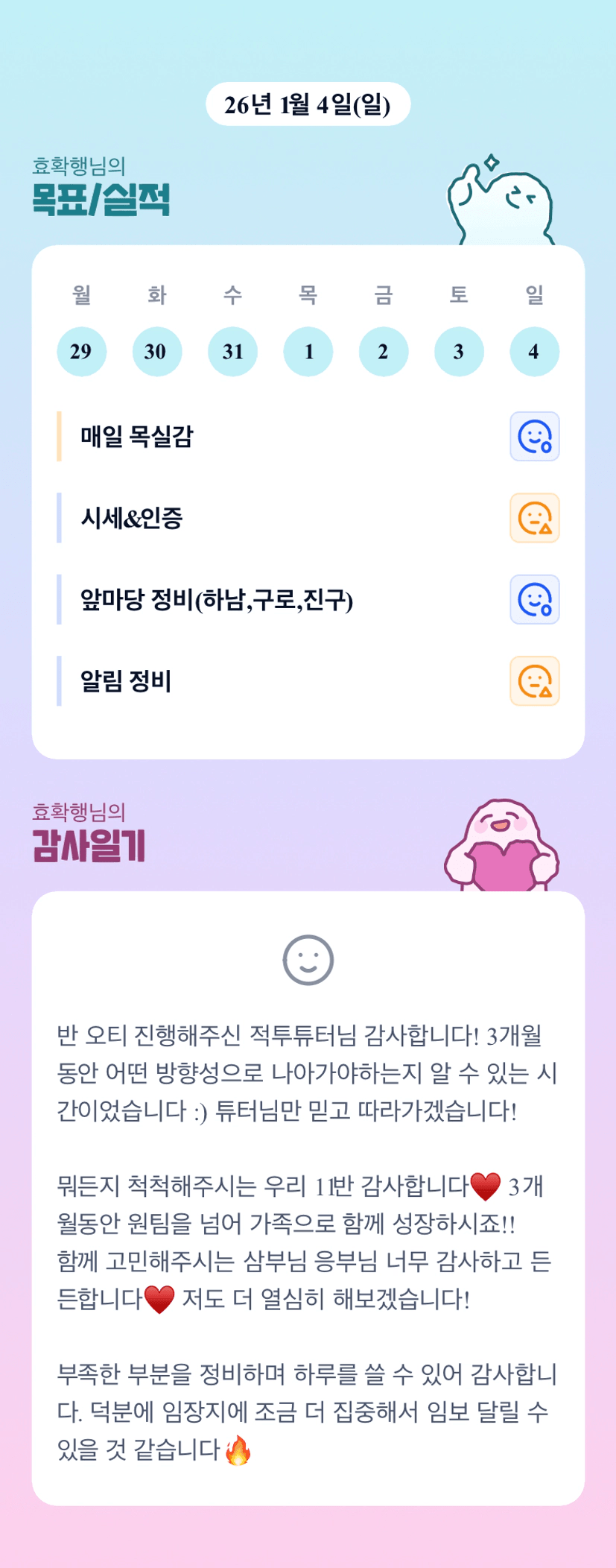효장님 덕분에 넘넘 기대되는 3개월 입니다~! 오늘도 에너지 뿜뿜 나눠 주셔서 감사합니다 ^^