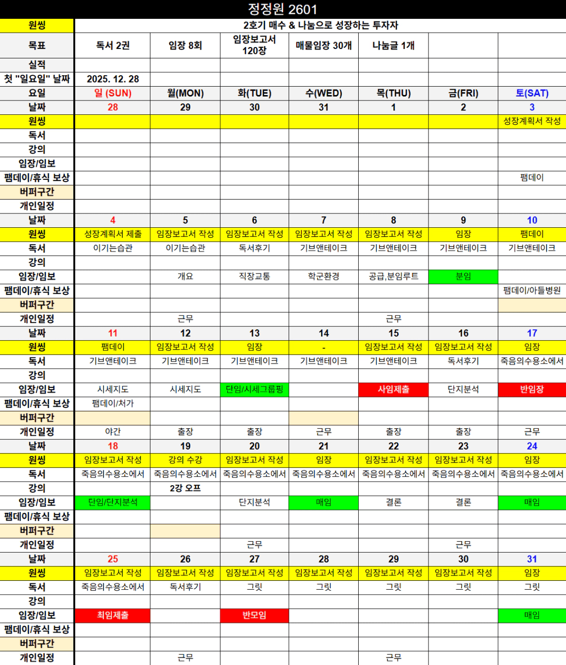 | 임장 | - 배정임장지에 몰입하기 - 앞마당 투자검토단지 매물 순서대로 보기 | - 분임, 단임, 매임 캘린더에 넣은대로 우선순위로 실행 - 정해진 날짜에는 임장지에 무조건 간다. |