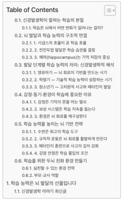 아래 사진처럼 목차가 되어있는 글들이 있는데, 가장 아래에 있는 ' 학습 능력은 뇌 발달의 산물입니다' 가 h1으로 되어있는 것 같고 그 위에있는 소제목들은 그것보다 소제목으로 되어있는 것 같아요. 소제목 위계를 맞춰주세요. 그리고 글 내용은 글머리 기호보다는 줄글 형태로 작성하고, 한 문단에 7~8문장을 들어가게 해달라고 gpt를 수정해보세요!