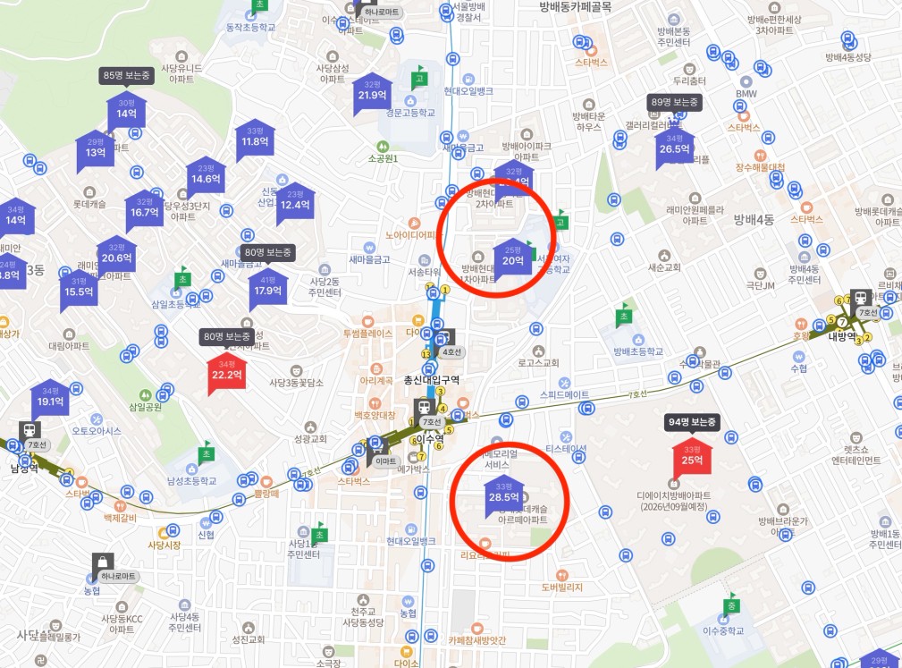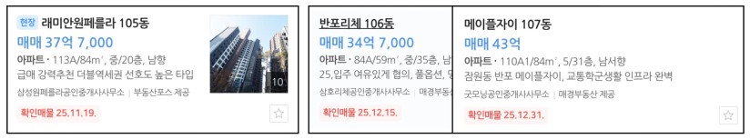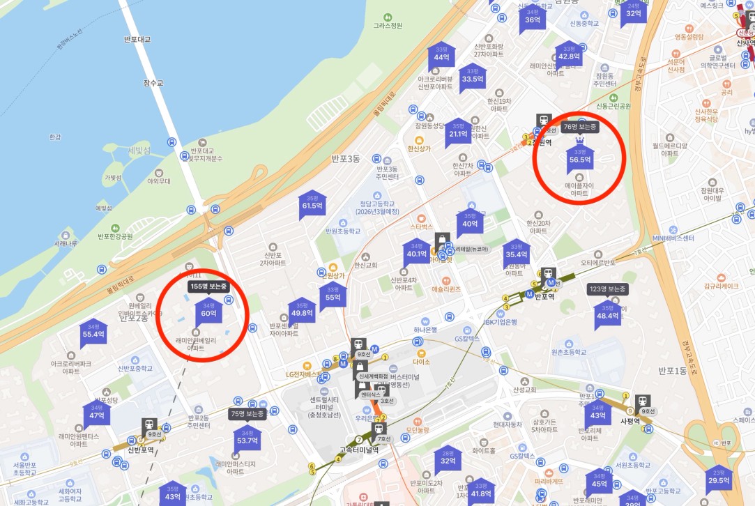 다음은 반포동으로 가볼게요. 우리나라를 대표하는 래미안원베일리와 25년 6월 입주한 3,000세대의 대단지 메이플자이. 처음으로 서초구를 24년에 갔는데 메이플 자이가 지어지고 다시 보니 정말 3천 세대 규모 정도면 한 마을처럼 보이는 정도로 잘 지어둔 것 같더라구요. 메이플자이 84기준 43억이면 원베일리 59를 할 수 있는 금액까지도 가는데 매물마다도 꼼꼼하게 실제 물건이지도 확인해볼 필요가 있어요. 서초구는 특히나 허위 매물들도 많기에 전임도 중요하지만 매임을 하면서 현장에서 직접 봐야하는 게 중요하기도 해보입니다.