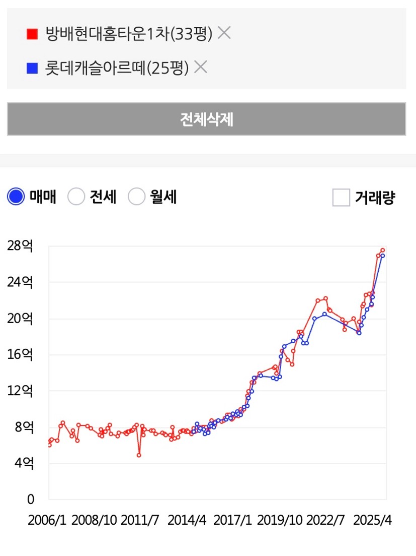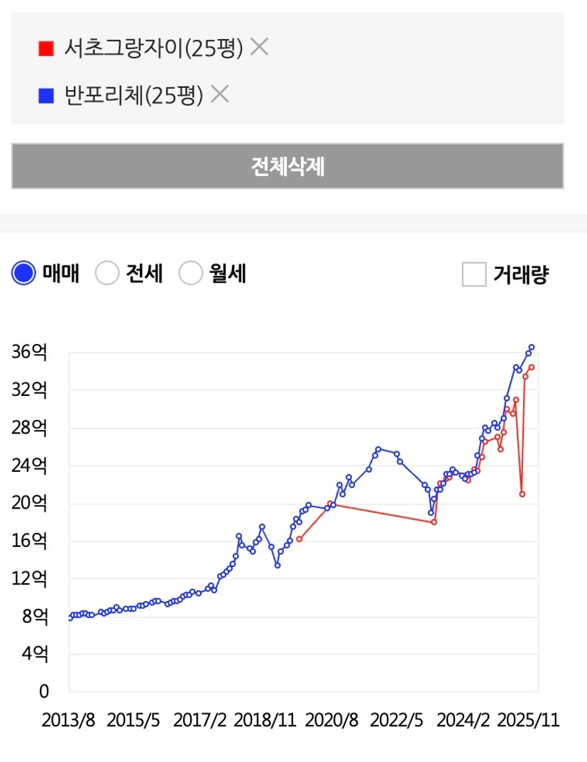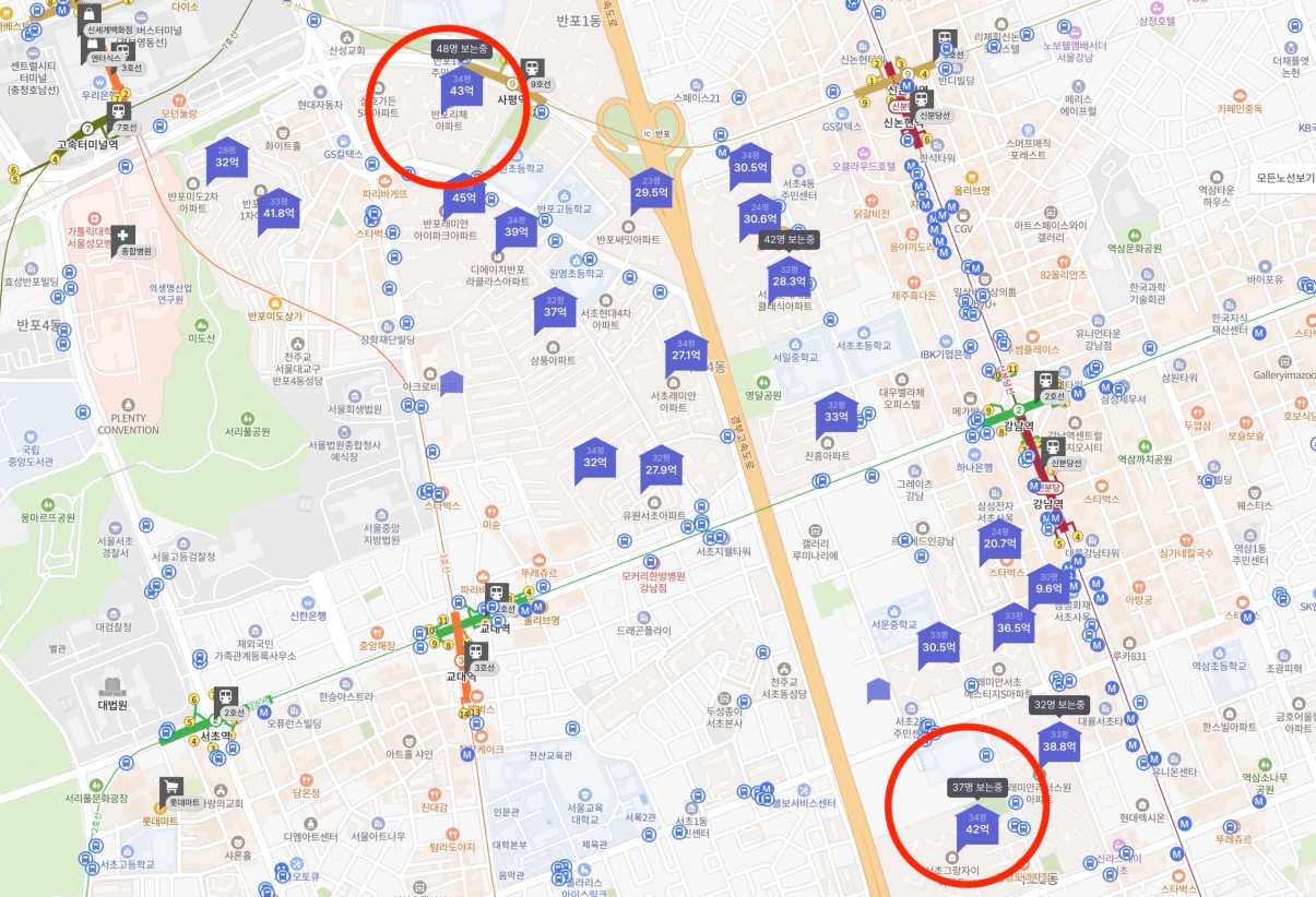 서초-반포쪽으로 좀 더 올라가보면 지금 네이버 호가 기준으로도 비슷한 가격을 보이는 늘 투닥투닥하는 두단지, 24년초 비슷한 가격까지도 계속 같은 흐름을 가져가던 서초그랑자이와 반포리체입니다. 확연히 이번 장에서 사람들은 반포라는 곳에 대한 열망을 보여주듯 가격이 서서히 벌어지는 모습도 보여주네요. 근데 정말 서초그랑자이 단지내 조경은 영혼을 갈아넣은 느낌이 들 정도로 화려했던 기억이 새록새록나네요.